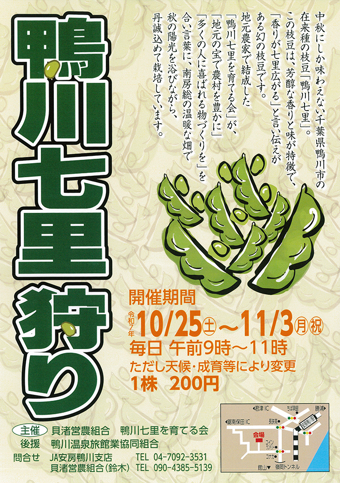 ☆鴨川七里狩りご希望の方は、貝渚営農組合にご連絡ください。